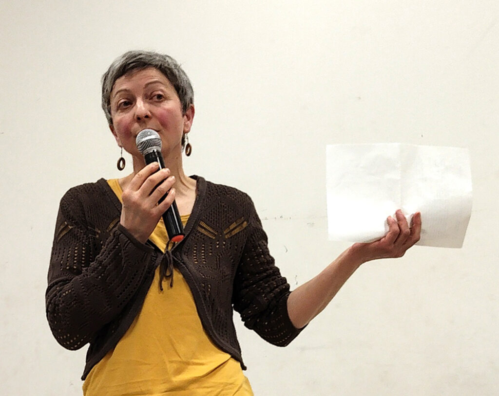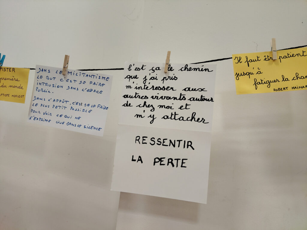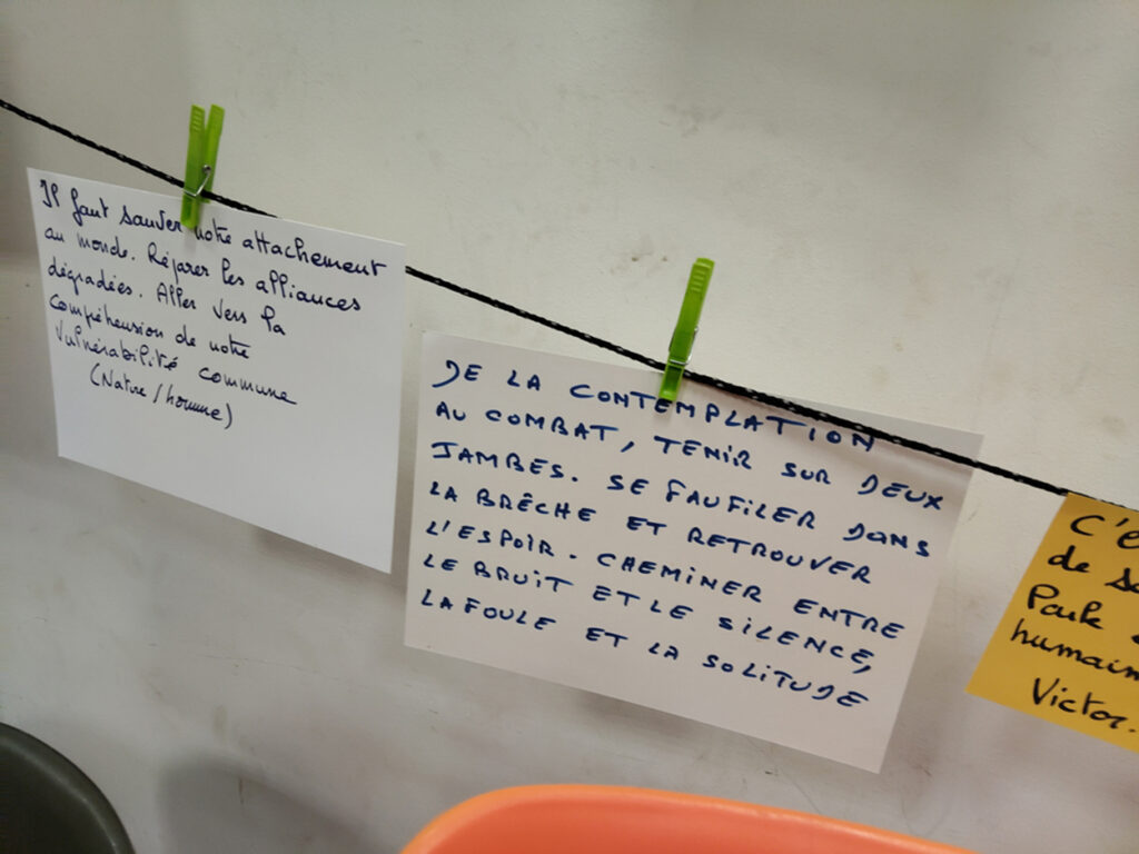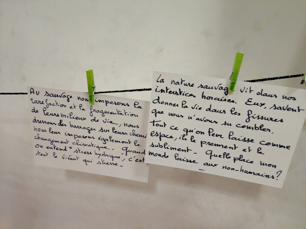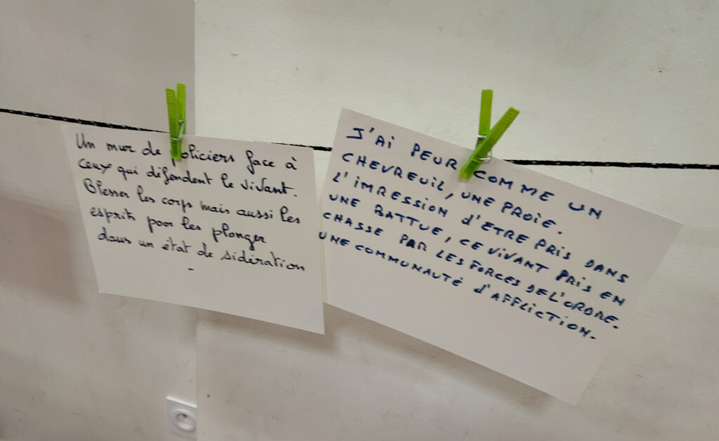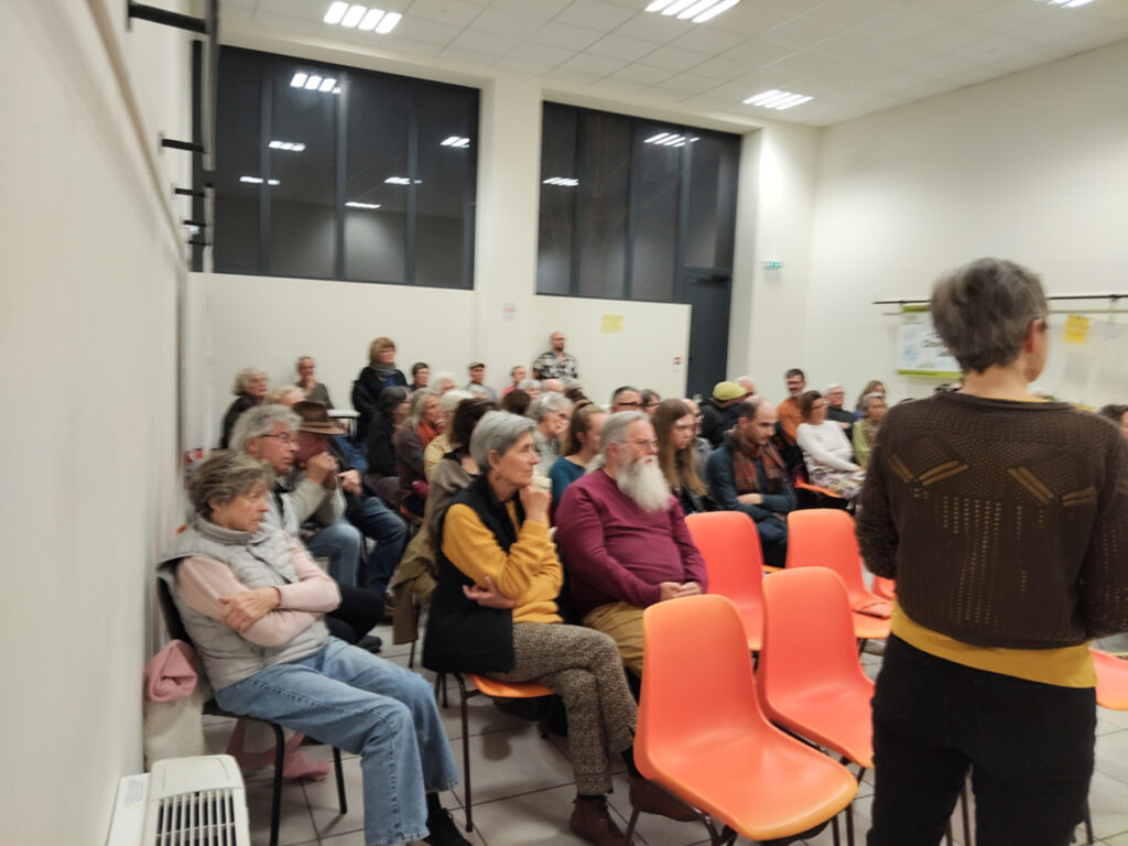 Les échanges ont ensuite été animés par Marie-Pascale Abel-Coindoz, éleveuse et membre de la Confédération paysanne, et Philippe Mesda, ancien forestier et membre d’associations de la protection de la nature. Marie-Pascale a évoqué son parcours : comment sa proximité avec le monde animal et paysan lui a fait prendre conscience de ce qu’il faut préserver et de ce qui se perd, du besoin de lutter pour défendre le vivant. Elle nous a parlé de sa tristesse devant les reculs, les défaites mais aussi du ressourcement que procure la résistance avec d’autres, avec des collectifs. Le Confédération paysanne lui offre ce cadre de réflexion et de lutte et elle nous a exhorté à ne rien lâcher.